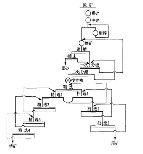首先利用原階段磨礦、階段浮選工藝及生產設備進行選礦試驗,然后將流程改為三段一閉路破碎流程,磨礦采用一段一閉路,浮選采用一次粗選、三次掃選、四次精選工藝流程。工藝流程如下圖。